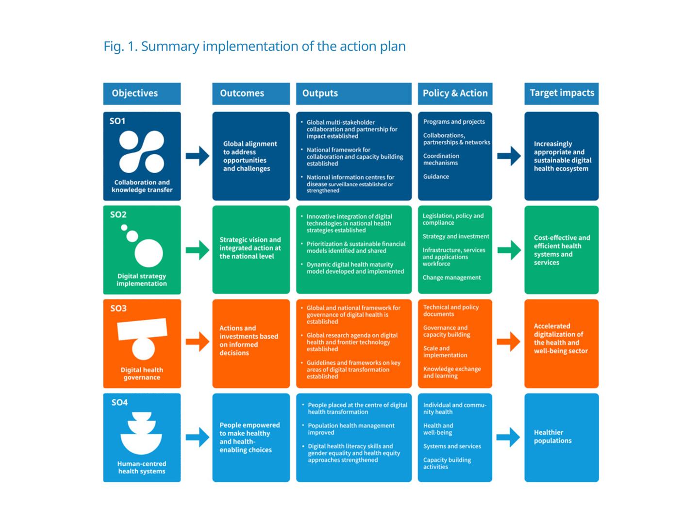 In the report Global strategy on digital health 2020-2025, the WHO defines 4 strategic objectives to promote and foster the digitization of the healthcare system, laying down a number of priority areas for action.