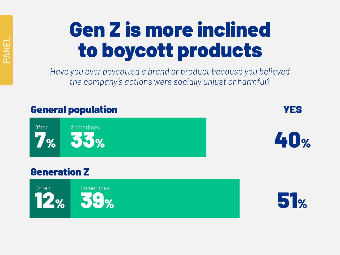 Confirming this growing ethical awareness, 51% of the new generation say they have already boycotted at least one company they consider socially unfair or dangerous, compared to 40% of the rest of the sample.