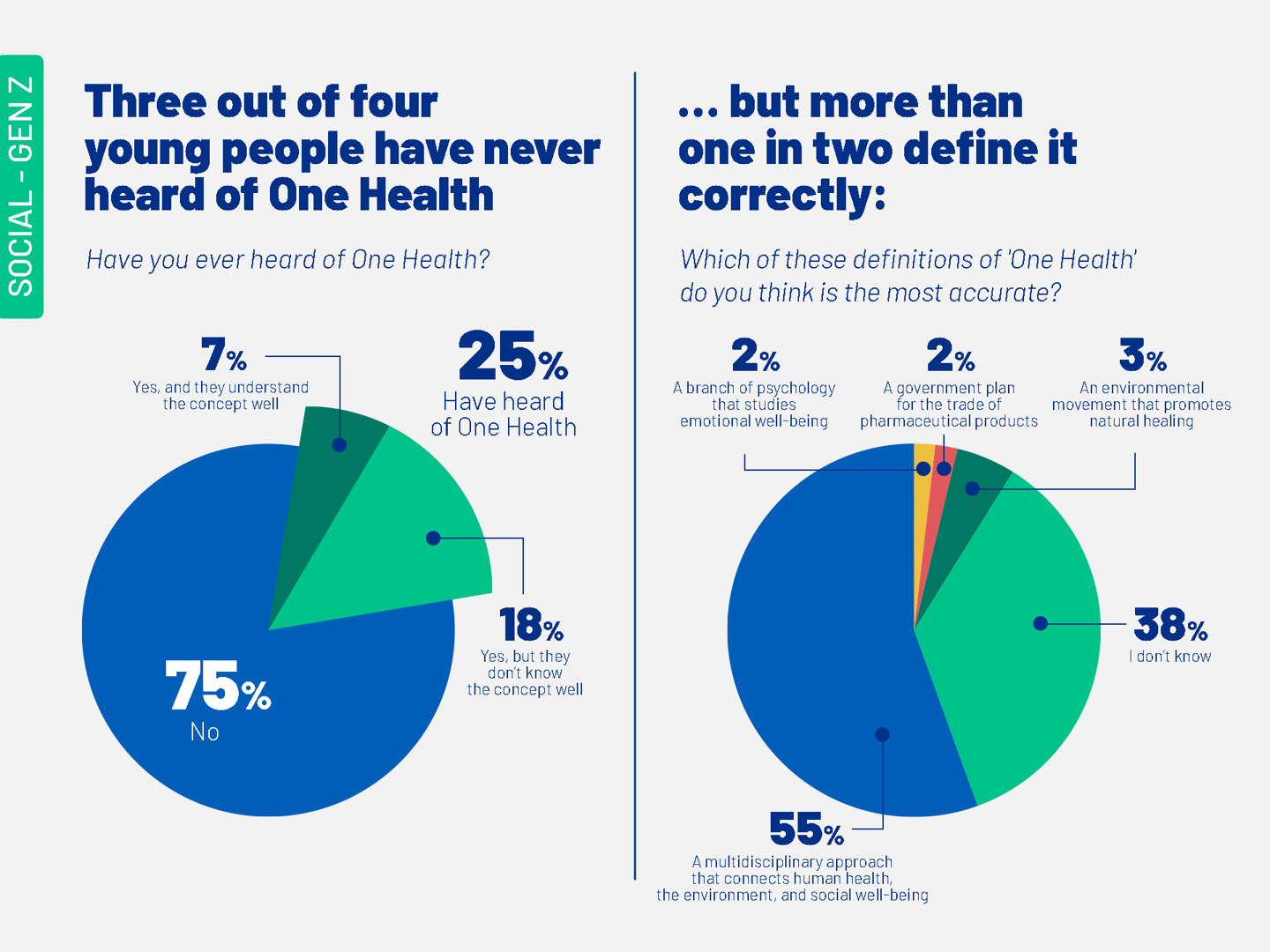 This aspect introduces the concept of 'One Health', an approach that brings together different disciplines and considers people's health, environmental protection and social well-being as interrelated. Although most under-30s were unfamiliar with the term, over 54% of them gave the correct definition from those proposed in the survey.