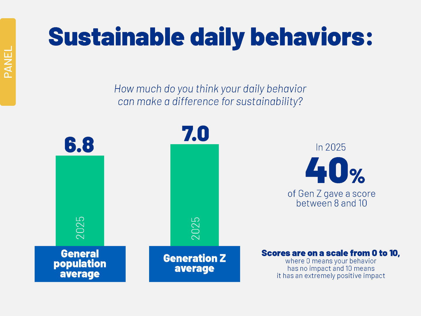 Looking to the future, 40% of Gen Zers believe in the value of individual contributions to improving current social conditions. For this reason, they expect a stronger push for sustainability from their own generation (40.6%), followed by politicians and world leaders (36.8%), large companies (34.1%) and, to a lesser extent, collaboration between the latter and governments (28.7%).