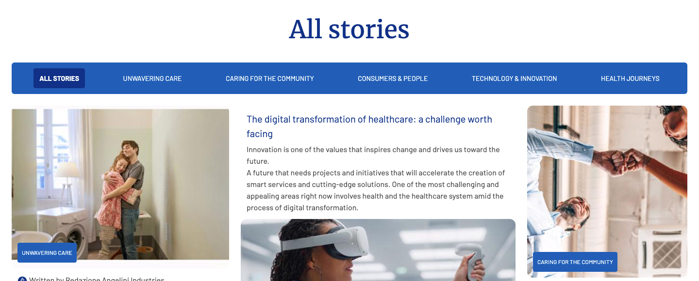The Stories behind the change were thus born, representing the great innovation of our site: a place of stories, people, and initiatives that tell the commitment and care of the Angelini ecosystem towards the world and those who inhabit it. Here, initiatives, themes, and Angelini-branded projects are explored with an external view and current scenarios. Five columns have been identified, ranging from Unwavering care, which tells how our purpose materializes in initiatives and projects, to Caring for the community, dedicated to our support for the territories and areas where we operate, passing through sections related to the commitment in business areas, such as Health Journeys, Technology and Innovation, Consumers & People. The Stories behind the change section, which will be enriched with new content every month, is also intended to be open to the contribution of our people, as well as external Opinion Leaders, and will reserve many surprises in terms of language and formats.