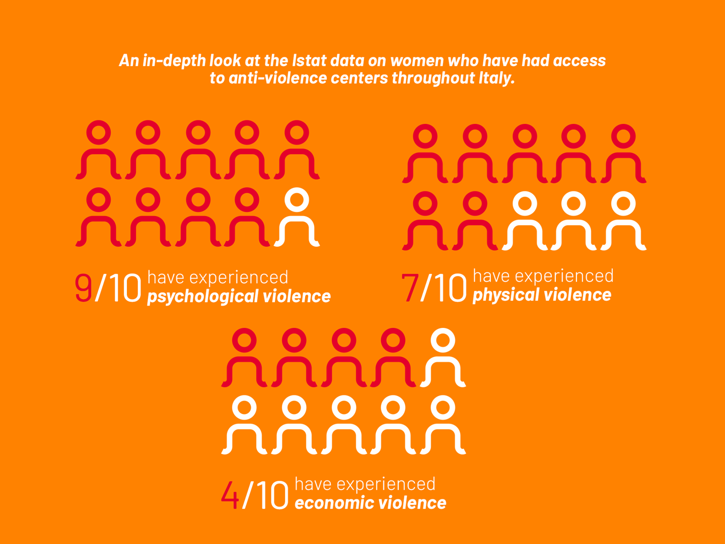 And according to the latest ISTAT data, of the total number of women who accessed all anti-violence centers nationwide, 9 out of 10 experienced psychological violence, 7 out of 10 physical violence, and 4 out of 10 economic violence.