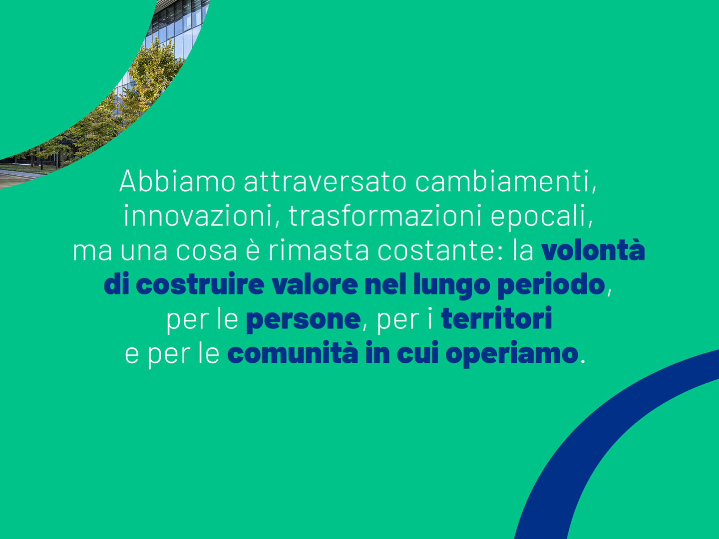 Abbiamo attraversato cambiamenti, innovazioni, trasformazioni epocali, ma una cosa è rimasta costante: la volontà di costruire valore nel lungo periodo, per le persone, per i territori e per le comunità in cui operiamo.