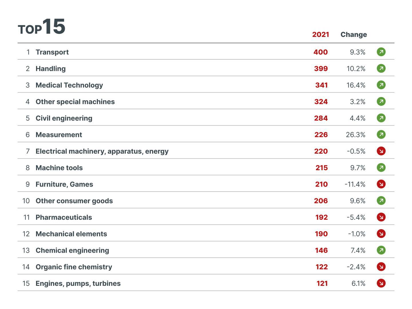 I 15 settori tecnologici leader in Italia - EPO nel 2021 – statistiche di EPO Patent Index 2021 pubblicate ad Aprile 2022.