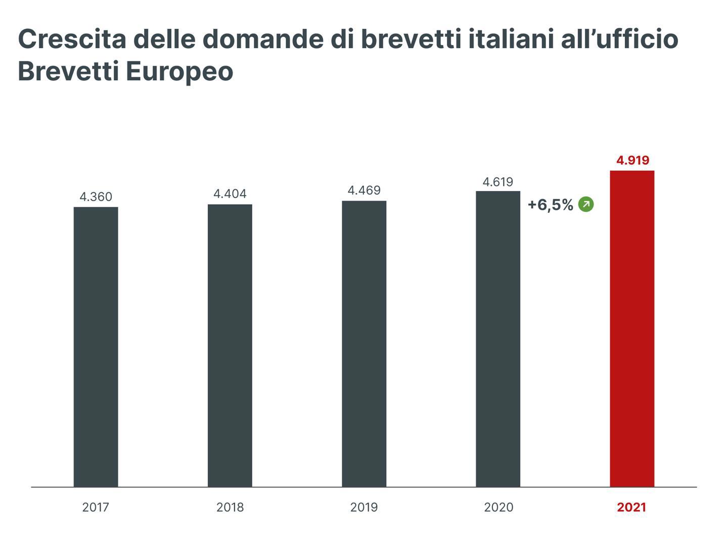Le domande di brevetto provenienti dall’Italia e dirette a European Patent Office (EPO) dal 2017 al 2021, secondo le statistiche di EPO Patent Index 2021 pubblicate ad Aprile 2022.