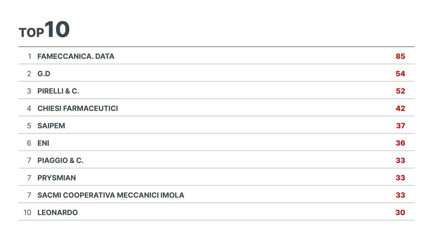 Tra le aziende italiane che hanno aumentato la domanda, conquista la medaglia d’oro Fameccanica, l’azienda di automazione e robotica di Angelini Industries che con 85 brevetti ha battuto aziende di fama mondiale.