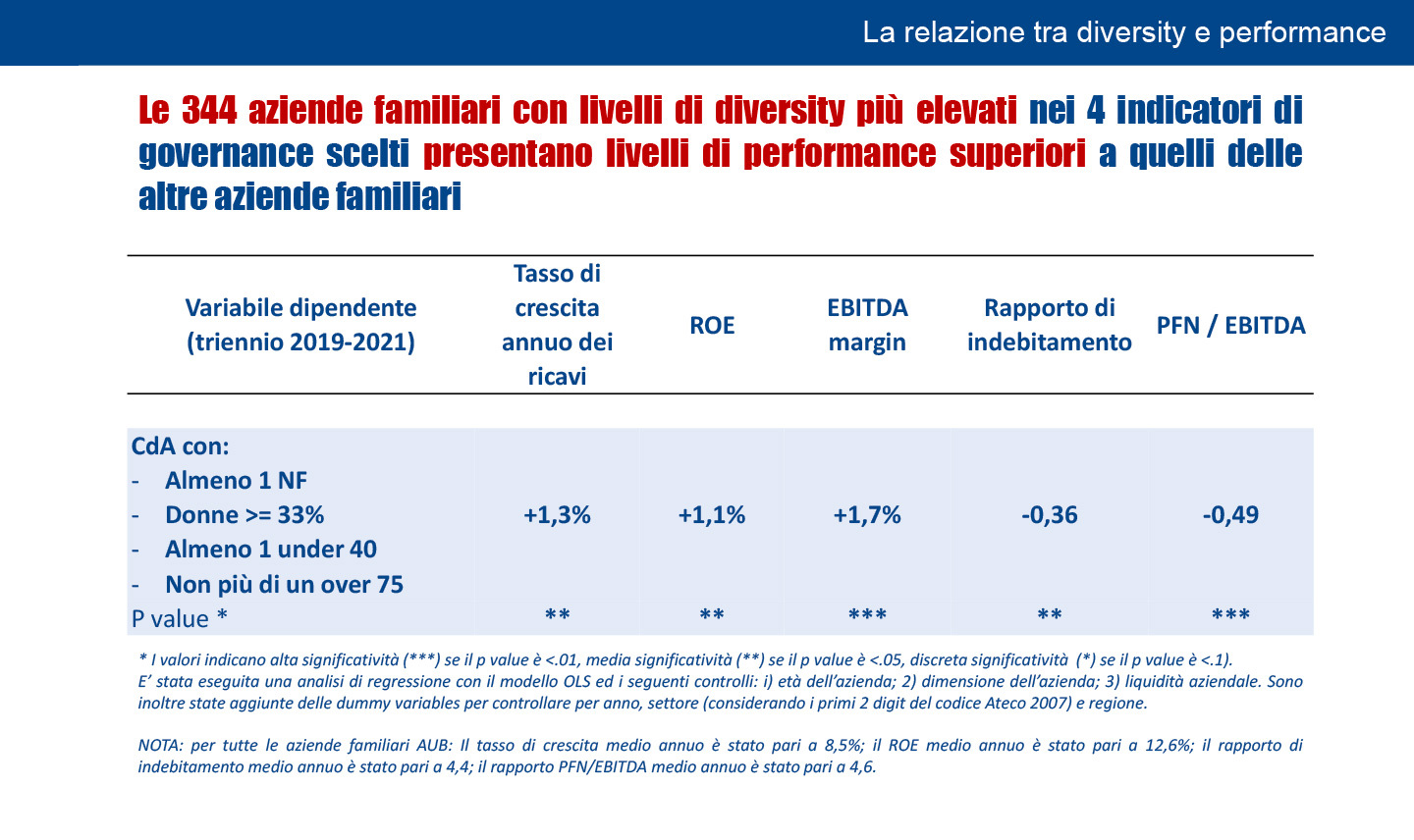 NB: per tutte le aziende familiari AUB: Il tasso di crescita medio annuo è stato pari a 8,5%; il ROE medio annuo è stato pari a 12,6%; il rapporto di indebitamento medio annuo è stato pari a 4,4; il rapporto PFN/EBITDA medio annuo è stato pari a 4,6.