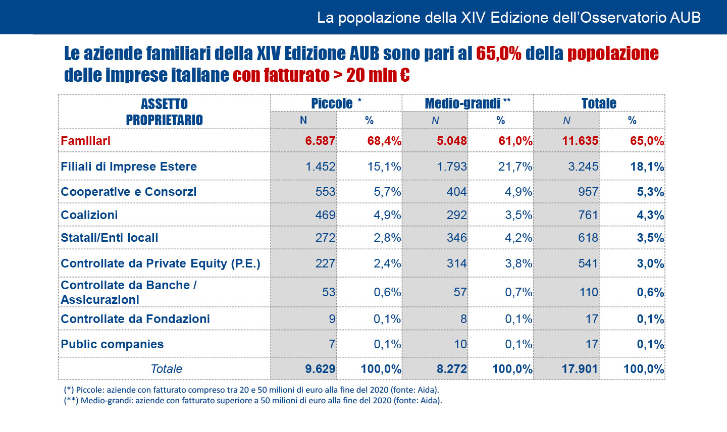 È questo ciò che emerge dai dati del XIV Osservatorio AUB, promosso da AIDAF, (Associazione Italiana delle Aziende Familiari), Cattedra AIDAF-EY di Strategia delle Aziende Familiari dell’Università Bocconi, UniCredit e Cordusio e Fondazione Angelini. Lo studio, presentato lo scorso Gennaio, indaga i bilanci delle 11.635 aziende familiari italiane con fatturato superiore ai 20 milioni di euro che rappresentano il 65% delle imprese italiane.