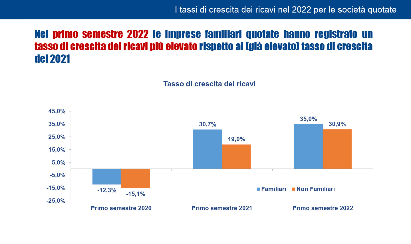 Il grafico dimostra come nel Primo semestre 2022 le imprese familiari quotate abbiano registrato un tasso di crescita dei ricavi pari a oltre il 15% delle imprese non familiari nel 2021 (35% vs 19%).