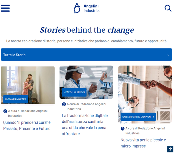 Nascono così le Stories behind the change, che rappresentano la grande novità del nostro sito: un luogo di storie, persone e iniziative che raccontano l’impegno e la cura dell’ecosistema Angelini verso il mondo e chi lo abita. Qui iniziative, temi e progetti targati Angelini vengono approfonditi con uno sguardo all’esterno e agli scenari attuali. Cinque le rubriche individuate. Si va da Unwavering care, che racconta come il nostro purpose si sostanzi in iniziative e progetti, a Caring for the community, dedicata al nostro sostegno ai territori e agli ambiti in cui operiamo, passando per rubriche legate alla declinazione dell’impegno nelle aree di business, come Health Journeys, Technology and Innovation, Consumers & People. Arricchita ogni mese da nuovi contenuti, la sezione delle Stories behind the change è destinata ad aprirsi anche al contributo delle nostre persone, nonché di Opinion Leader esterni e riserverà tante sorprese anche in termini di linguaggi e formati.
